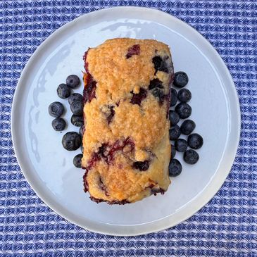 Fresh blueberry bread wit a sweet cinnamon, sugar, and buttery topping