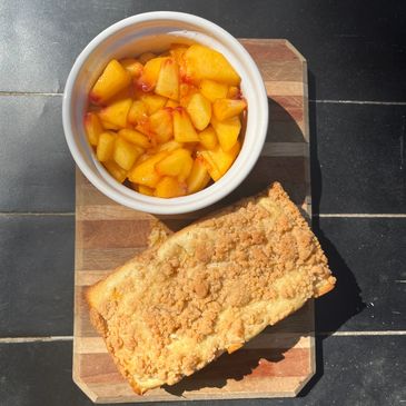 Soft, moist loaf filled with juicy peaches and topped with a buttery cinnamon-sugar crumble, just like the classic dessert in bread form.